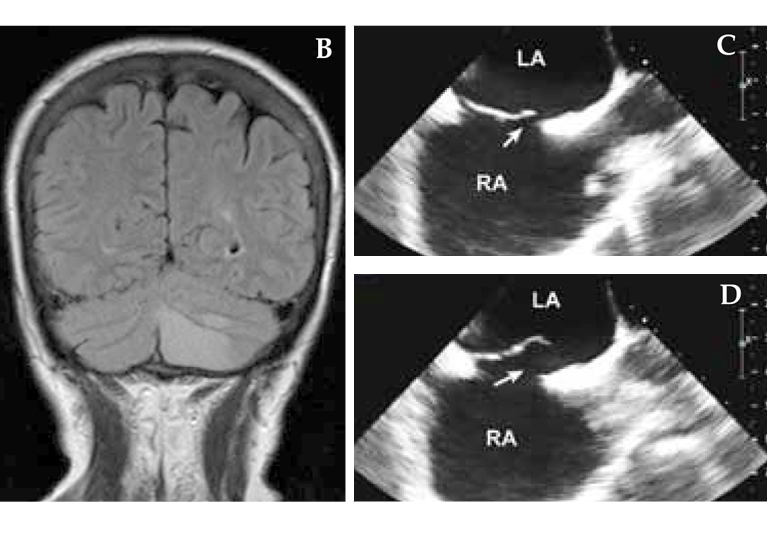 A 63-year-old woman who had a remote history of migraine awakened with a headache with visual aura, as well as nausea, vomiting and incoordination. She was a former smoker but had no history of hypertension, estrogen replacement or family history of stroke. A and B. MRI demonstrated a left cerebellar infarct. C and D. Transesophageal echocardiography demonstrated a large PFO (arrow) with an atrial septal aneurysm. E. Contrast injection demonstrated generous flow across the PFO (arrow) with Valsalva. Percutaneous closure was performed. LA, left atrium; RA, right atrium.