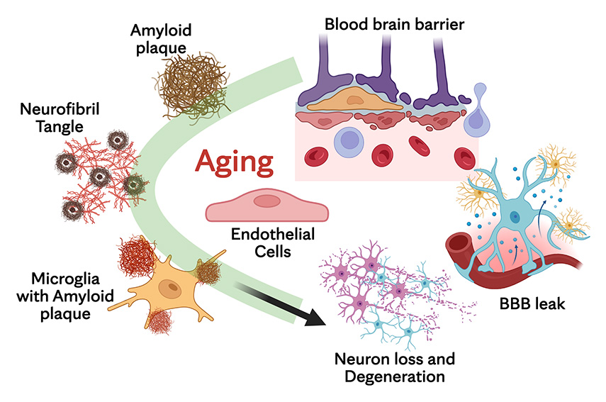 This schematic illustration shows our research on vascular dysfunction, blood-brain barrier (BBB) leakage, and neuronal loss characteristic of aging and age-related neurodegenerative diseases. We're exploring how aging contributes to neurovascular dysfunction and neurodegeneration. With advancing age, endothelial cells in the brain undergo structural and functional decline, leading to blood-brain barrier disruption. This increased permeability allows toxic molecules and inflammatory mediators to enter the brain, exacerbating the accumulation of amyloid plaques and neurofibrillary tangles. Activated microglia further amplify inflammation, promoting neuronal stress and degeneration.